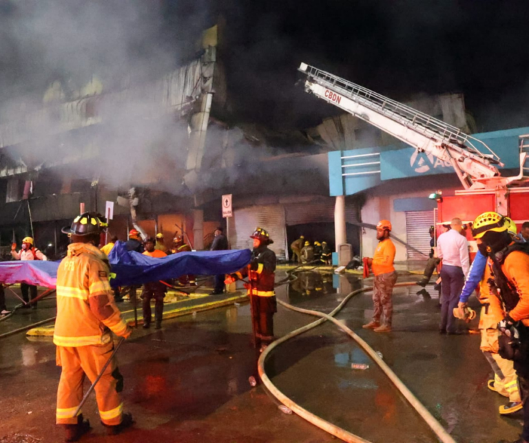 Santo Domingo.- Alrededor de 10 unidades del Cuerpo de Bomberos de Santo Domingo trabajan intensamente para sofocar un incendio registrado la tarde de este jueves en el establecimiento comercial LYR, ubicado en la avenida Charles de Gaulle esquina Hermanas Mirabal.