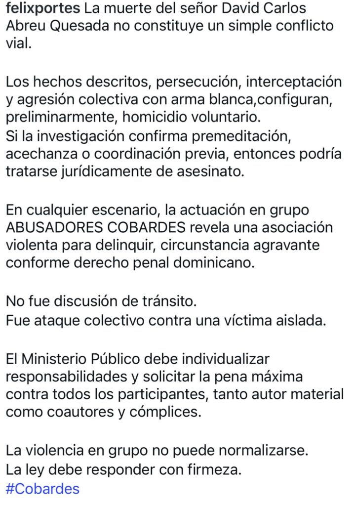 La muerte de David Carlos Abreu ha conmocionado al país por la magnitud de los hechos. A raíz de este caso, el abogado Félix Portes explicó, a través de sus redes sociales, que de confirmarse elementos como persecución, interceptación y agresión colectiva con arma blanca, el hecho podría ser calificado como asesinato, en caso de comprobarse premeditación o coordinación previa.